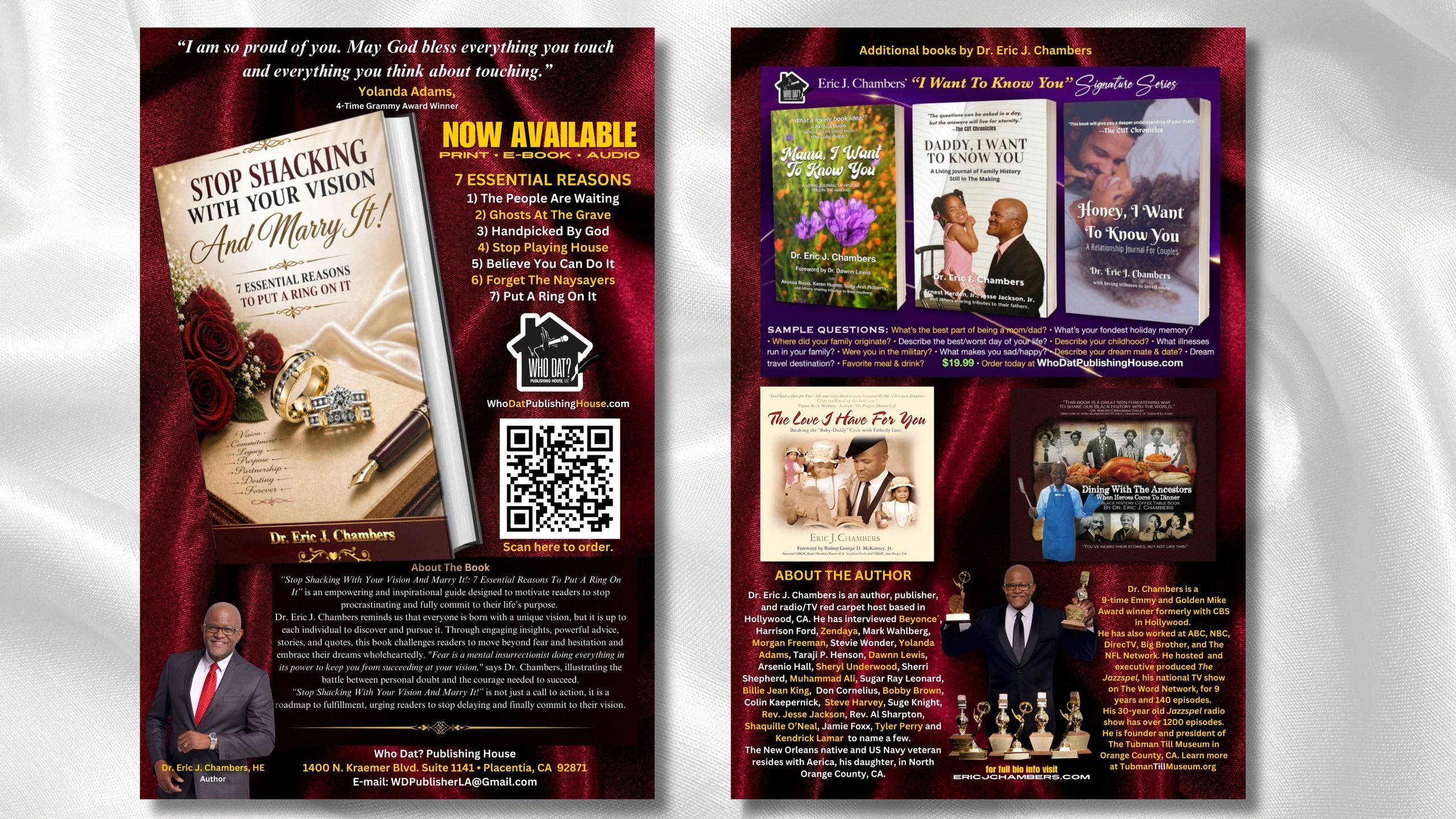 In 2005, we released "Dining With The Ancestors: When Heroes Come To Dinner." It is a beautiful coffee table picture book featuring some of Hollywood's most notable stars including Tyler Perry, Kendrick Lamar, Taraji P. Henson, Gladys Knight, Morgan Freeman, Jill Scott, Cedric The Entertainer, Dawnn Lewis, T'Keyah Crystal Keymah, Willard Pugh, Tyrese, Ne-Yo and more.